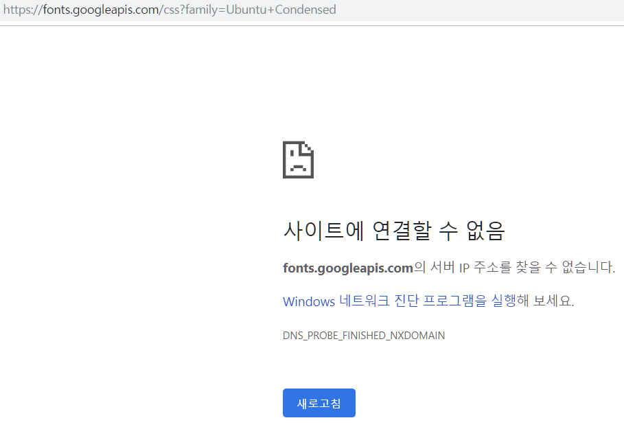 이 블로그의 폰트가 제대로 적용되지 않아 콘솔을 확인 한 결과 google font의 사이트를 방문하지 못하고있었다.