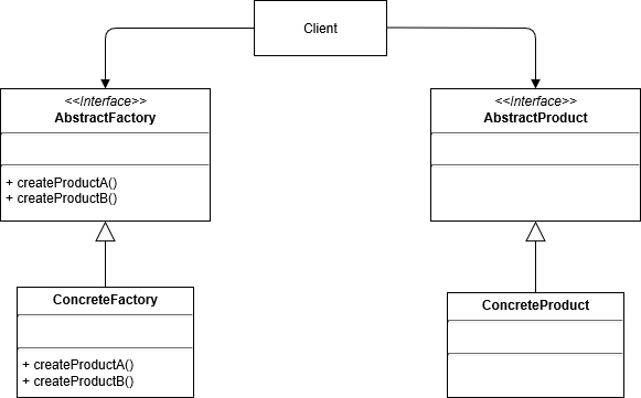 추상 팩토리 패턴은 인터페이스를 이용하여 서로 연관된, 또는 의존하는 객체를 구상 클래스를 지정하지 않고도 생성할 수 있다.