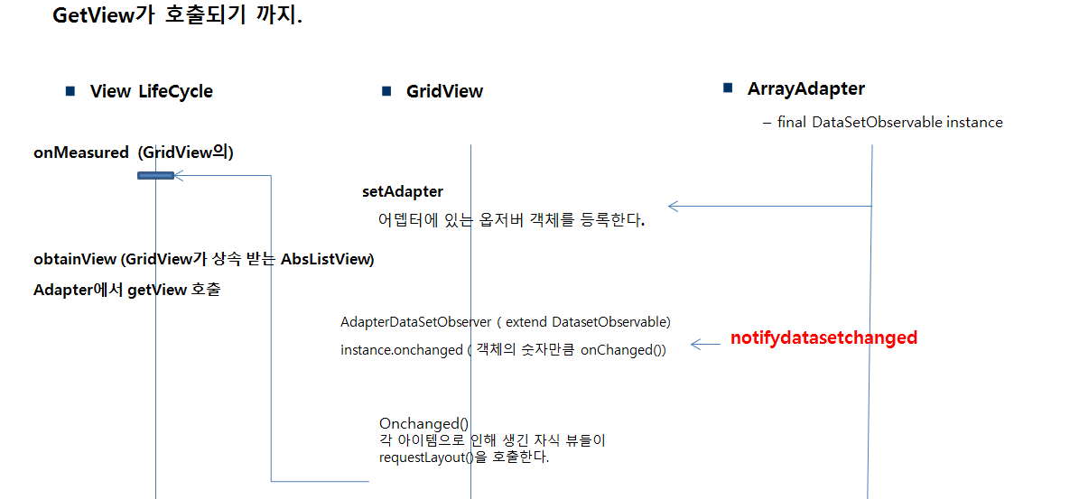 onChanged() 단계에서 각 view들이 자기자신을 requestLayout을 하면 listview는 자신의 자식이 붙어있는지를 확인 후 아이템의 수 만큼 getview를 호출되게 된다.