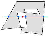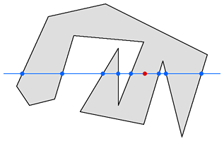 해당 점의 왼쪽으로 반직선을 그었을 때(혹은 오른쪽으로 반직선을 그었을 때) 다각형과 마주치는 부분이