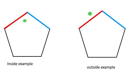 이때 왼쪽의 그림은 초록색 점이 다각형 내부에 있음을 알 수 있고, 오른족 그림은 외부에 있음을 알 수 있다.
