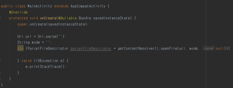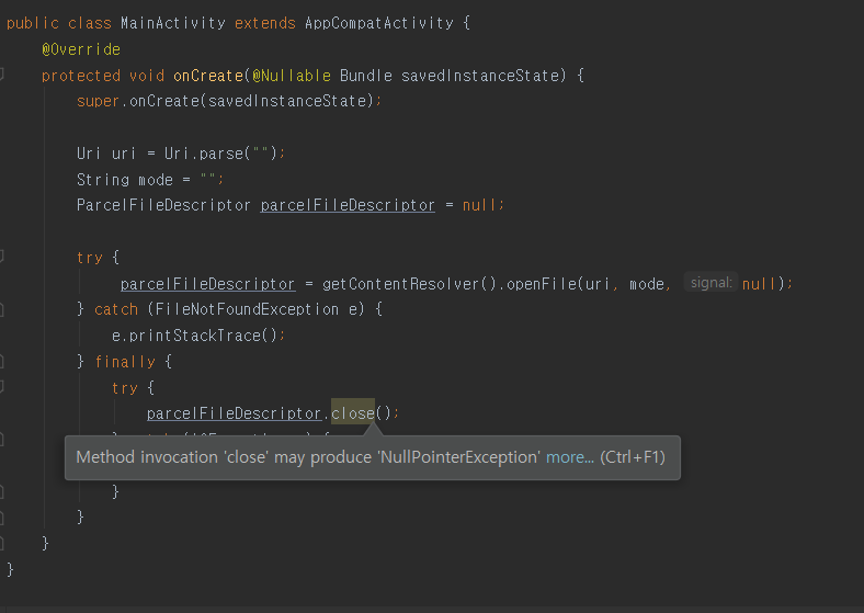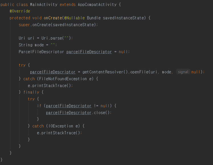 아래 코드는 실제 ParcelFileDescriptor 객체를 타고 들어가면 볼 수 있는 AutoClosable 구현체이다.