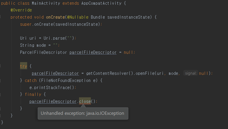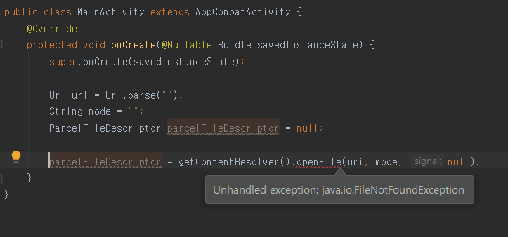 아래와 같이 openFile이라는 코드를 사용하고자 하는데 바로 try catch문을 잡으라고 경고 메세지가 나타난다.