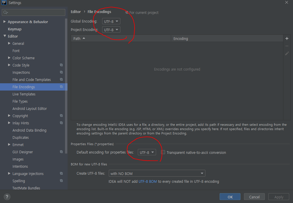 Search부분에 Encodings를 누른 후 아래와 같이 UTF-8로 설정