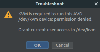 kvm is required to run this avd. /dev/kvm device permission denied