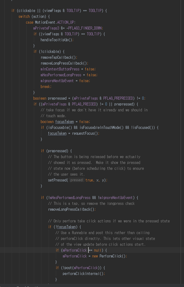 실제로 ACTION_UP에서 보면 performClick()를 호출하고 있다.