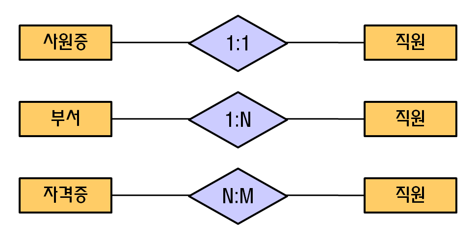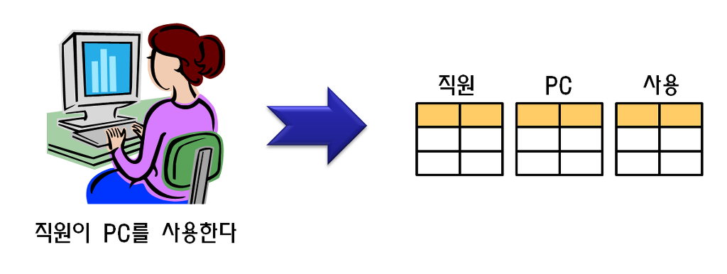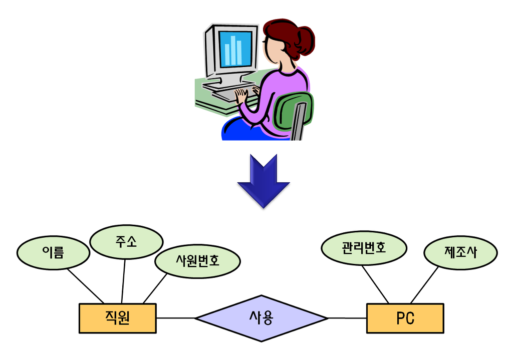 여기서 개체(Entity)란 저장되고 관리되어야 할 정보.. 즉, 현실 세계의 대상을 말하며 관계(Relationship)은 두 개체간의 연관성을 일컫는다. 위 그림에서 보면 직원과 PC는 개체이고, 그림에는 표현되어 있지 않지만 직원과 PC는 Many-to-Many(多 대 多)의 관계로 연결되어 있다. 관계를 맺어주는 방식에도 여러 가지가 있는데, 1대다(1:N), 다대다(N:M), 이항(Binary), 삼항(Ternary), 부분합(Subtype) 등이 있다.