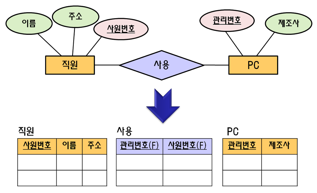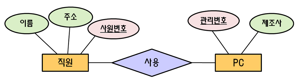 위 그림에서 직원 개체는 이름, 주소, 사원번호라는 속성을 가지고 있으며 PC 개체는 관리번호, 제조사를 속성으로 가지고 있다. 그리고 사원번호를 직원을 구분하는 식별자로 지정했고 PC는 관리번호로 식별된다.