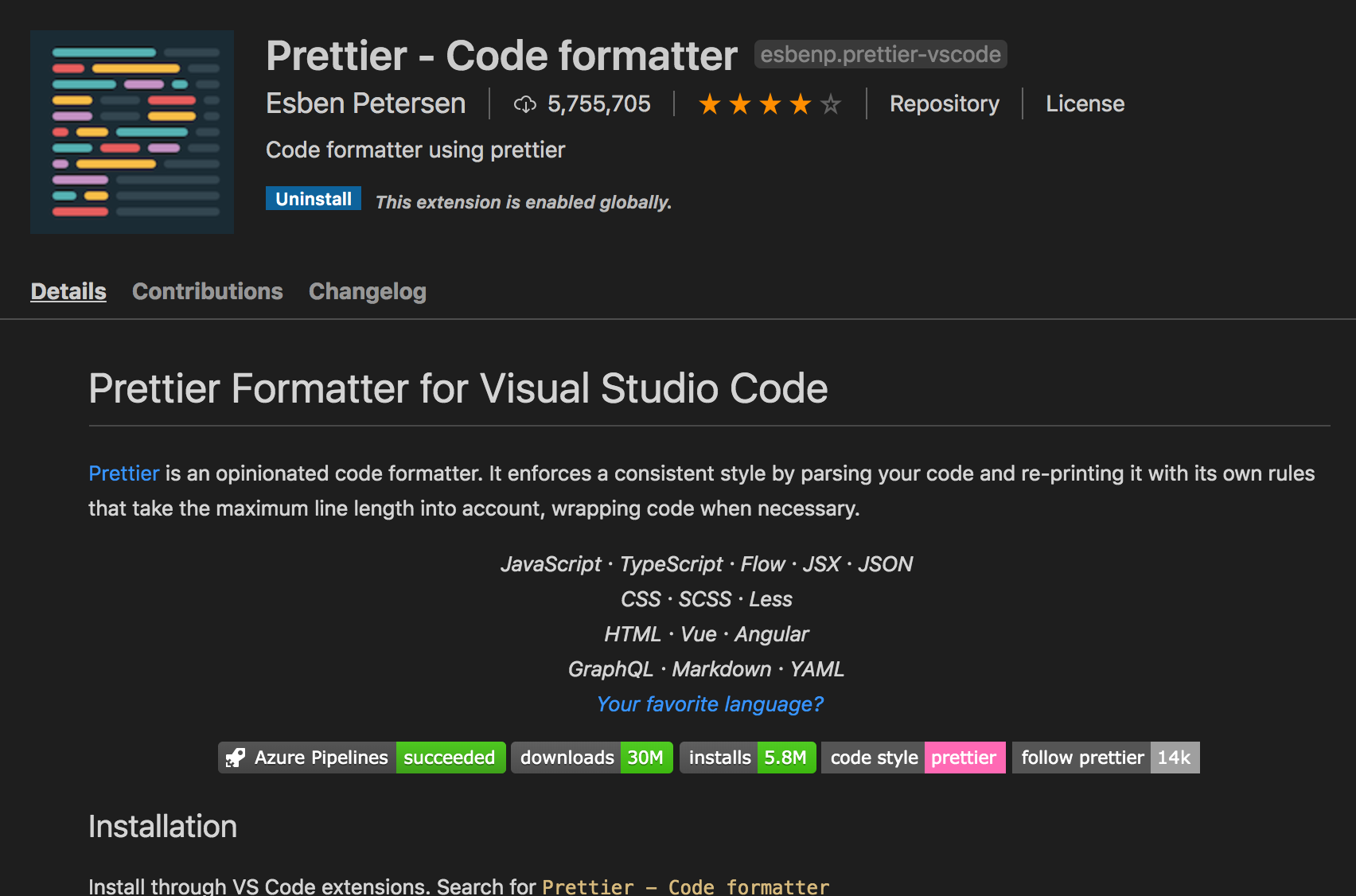 Visual Studio Marketplace 링크: https://marketplace.visualstudio.com/items?itemName=esbenp.prettier-vscode
