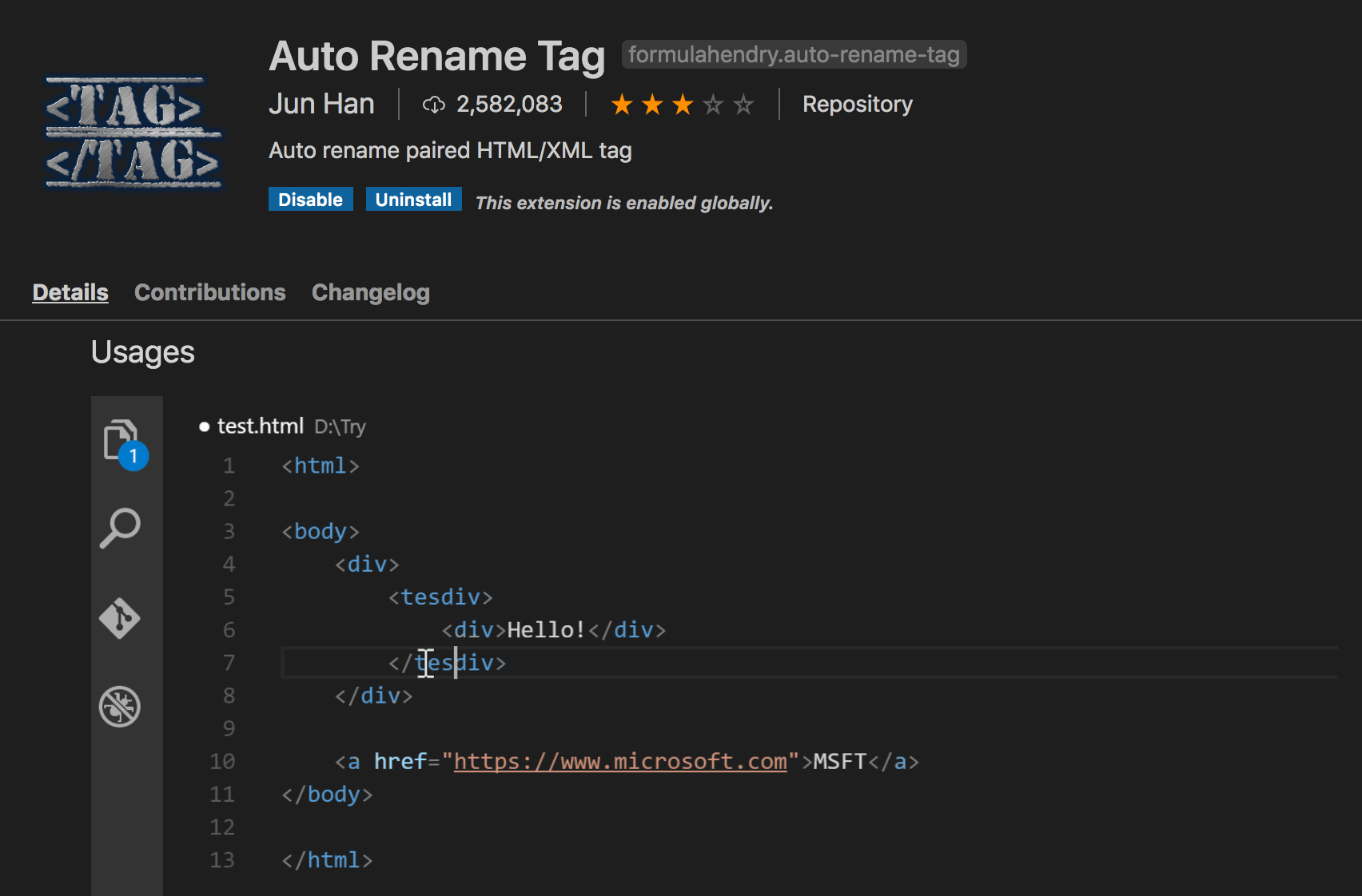 Visual Studio Marketplace 링크: https://marketplace.visualstudio.com/items?itemName=formulahendry.auto-rename-tag