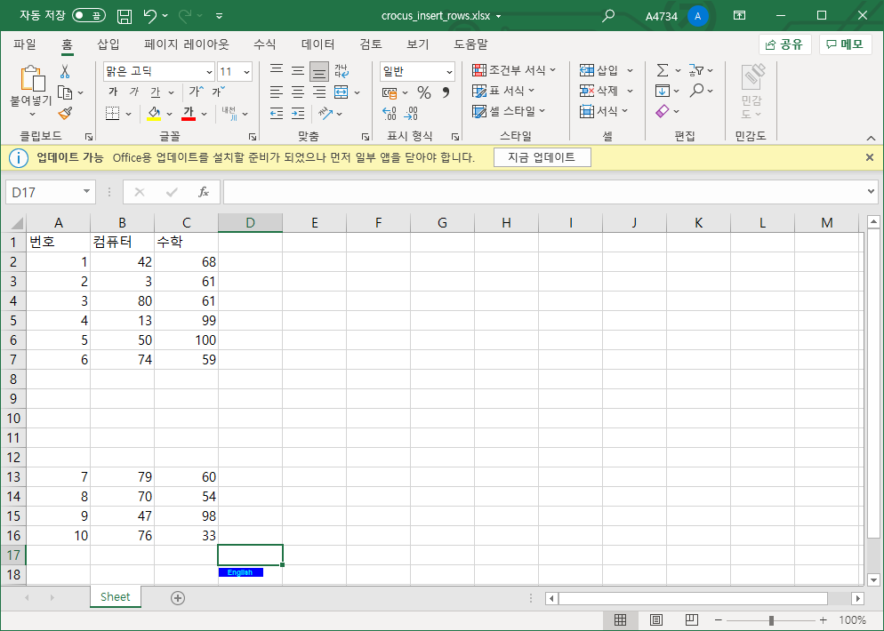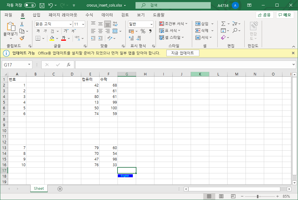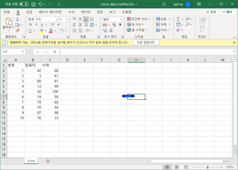 영어라는 데이터가 존재하면 해당 값을 컴퓨터로 수정한다.
