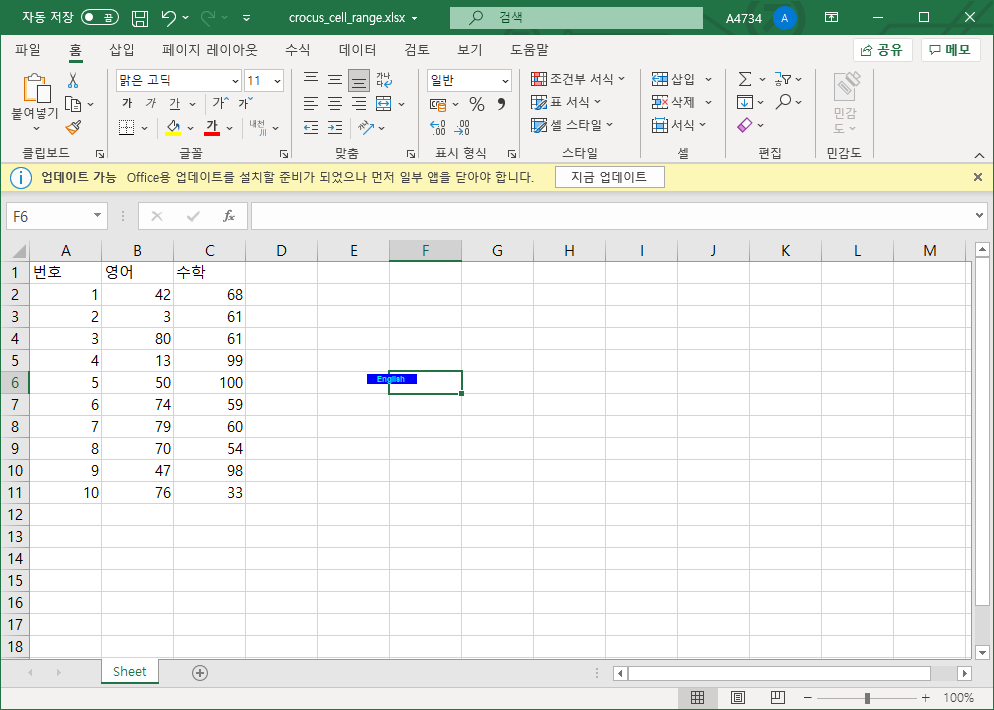 이때 row[0].value는 번호의 값들이고 row[1].value는 영어의 값, row[2].value는 수학의 값이다.