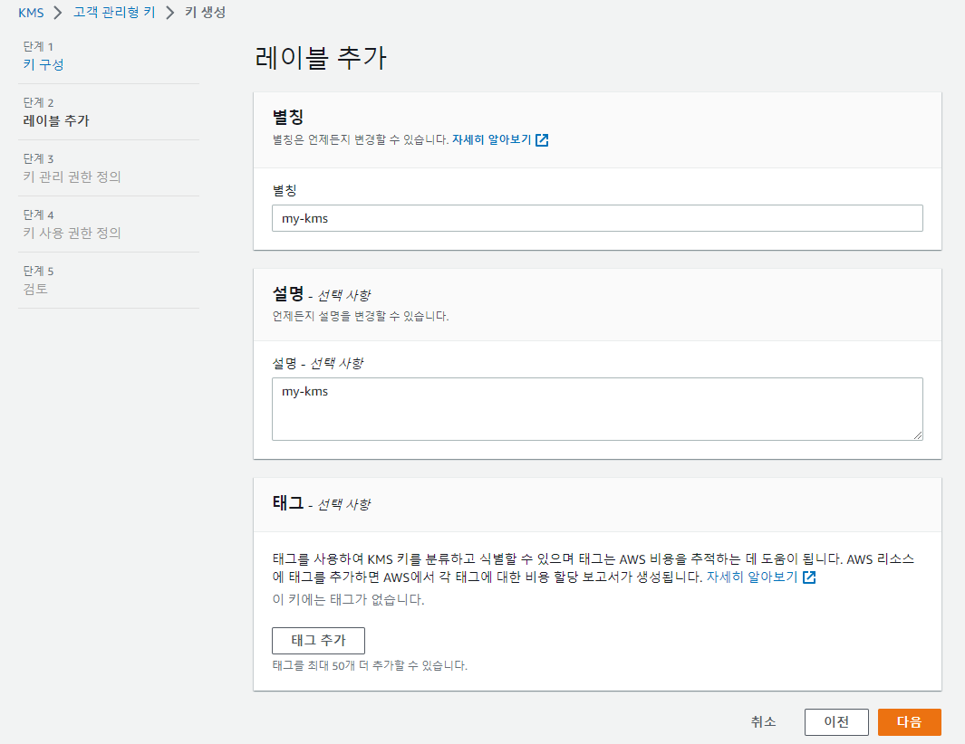 ✔ symmetric를 선택했기 때문에 AWS 계정으로만 KMS에 접근이 가능, 만약 다른 곳에서 AWS kms 에 접근하고 싶다면 Asymmetric를 사용하자.