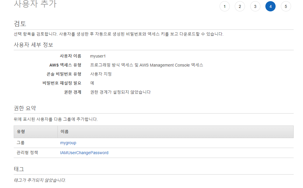 그룹은 앞서 만든 mygroup을 선택해준 후 계속 다음 버튼을 눌러 사용자를 만들어준다.