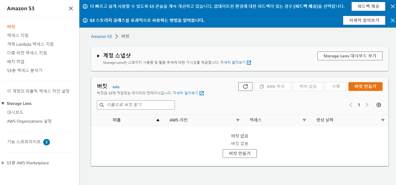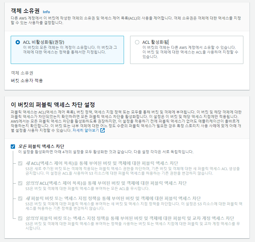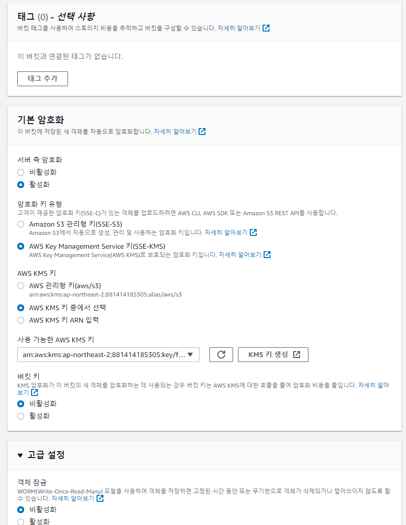 다음과 같이 버킷 만들기 탭에서 설정 후 버킷 생성을 누른다..