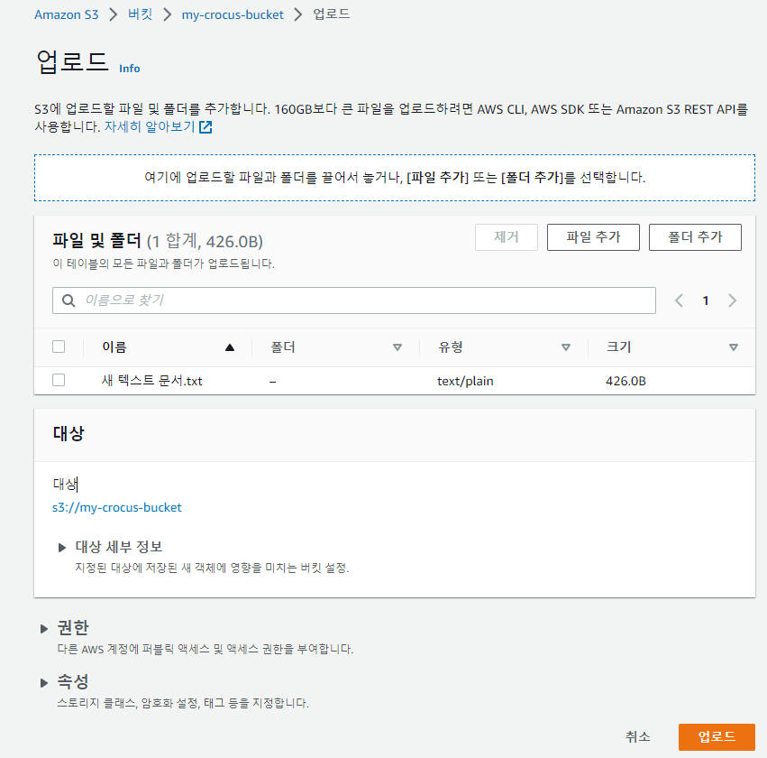 이제 버킷에 들어가서 업로드 버튼을 누르고 아무 파일을 하나 업로드 해보고자 한다.