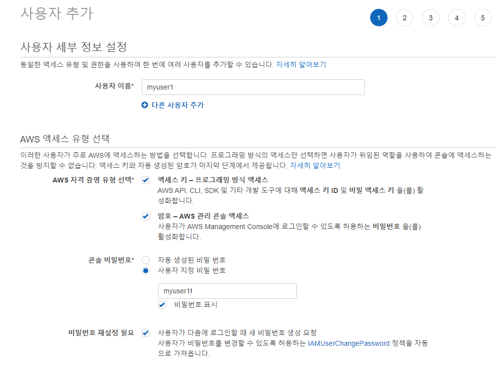 myuser1이 s3접근을 하고자 하니 myuser1에게 권한을 정의해준다.