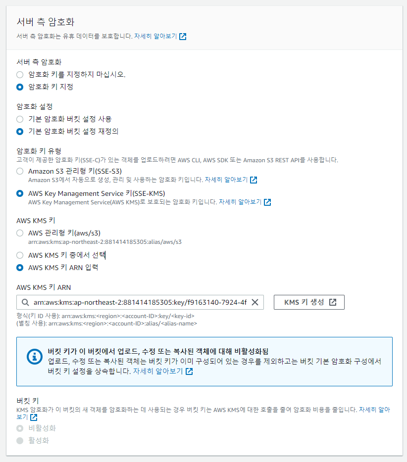암호화 키 유형 : AWS Key Management Service 키(SSE-KMS)