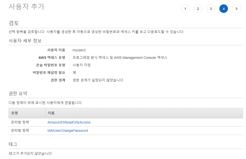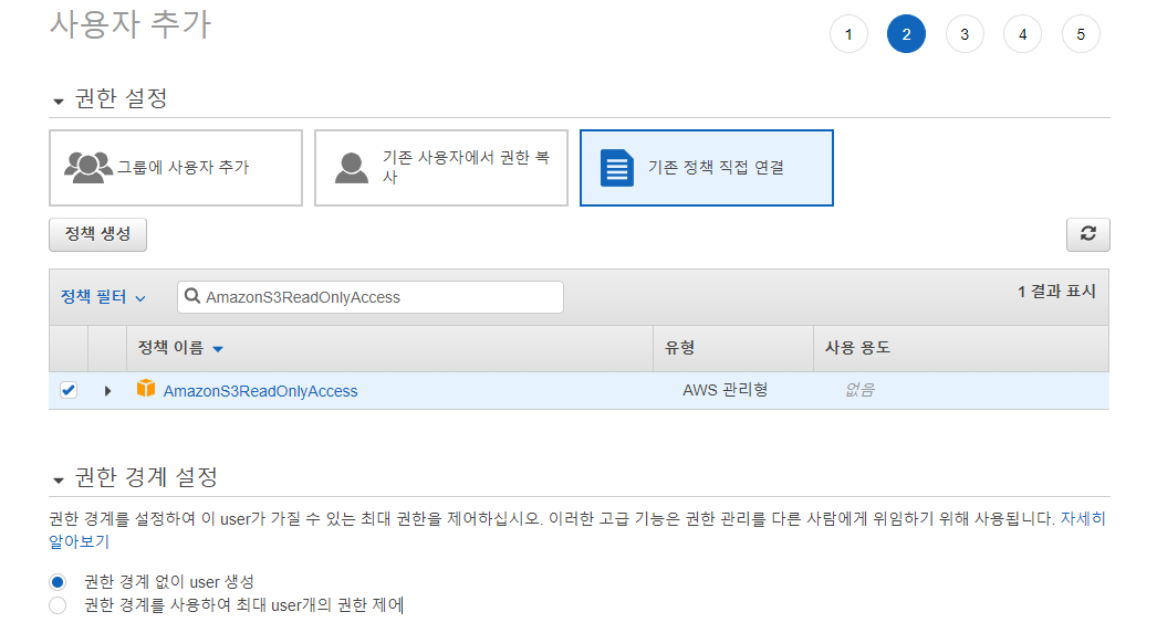 두번째 사용자는 AmazonS3ReadOnlyAccess를 준다.