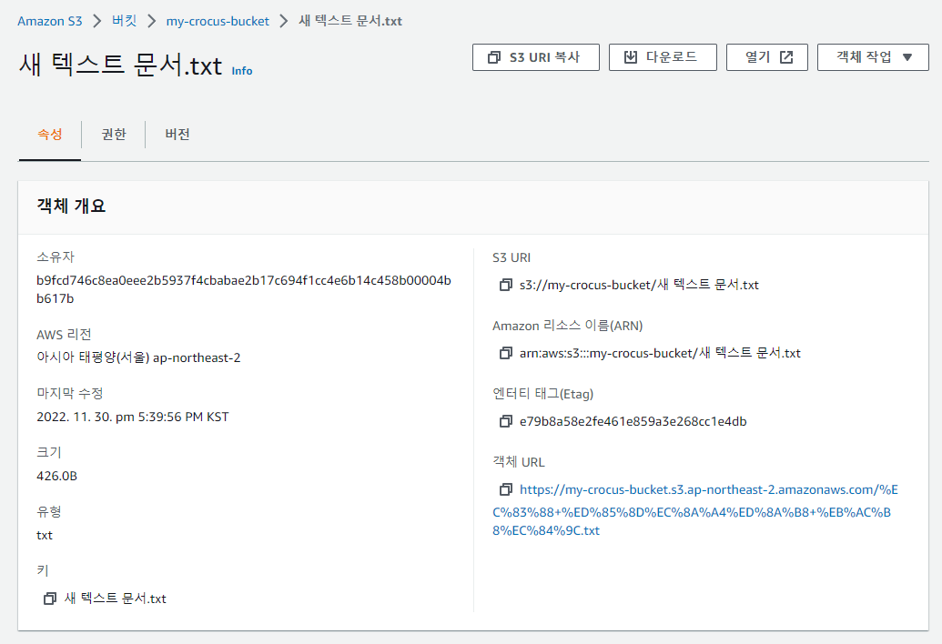 S3로 들어와서 방금 전 올린 파일을 다운로드 하면 정상 다운로드 됨을 알 수 있다.
