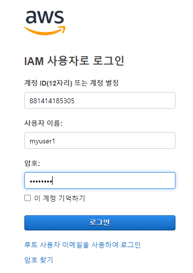 이제 로그아웃 후 IAM 사용자로 로그인을 클릭하여