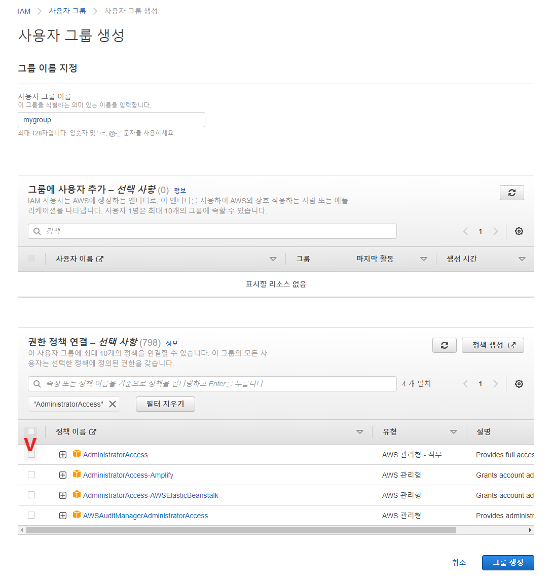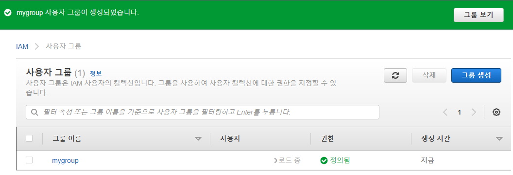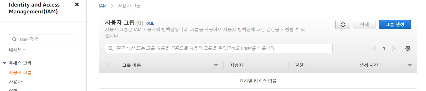 엑세스 관리 → 사용자 그룹 → 그룹 생성 클릭