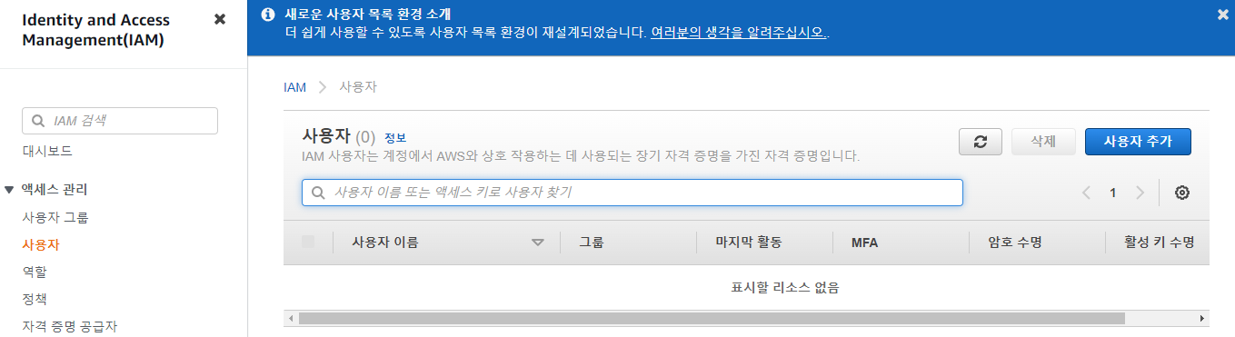 우선 IAM을 들어가서 엑세스 관리 → 사용자 탭에 들어가서